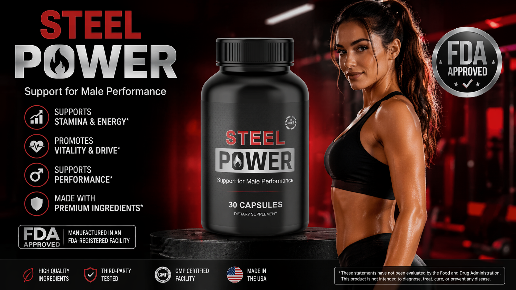 Steel Power Male Enhancement is a dietary supplement marketed as a support system for male performance. Packaged in a sleek black bottle with 30 capsules, it is designed for daily use. The product emphasizes enhancing stamina, endurance, and overall male vitality.